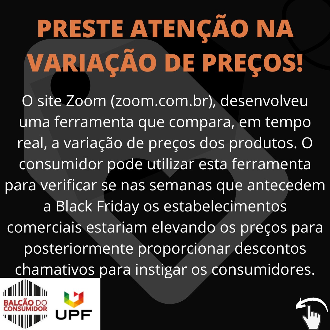 Coordenadora do Balcão do Consumidor Casca, a professora Me. Nadya Tonial destaca que o consumidor deve estar atento à variação de preço dos produtos na semana da Black Friday, ou até antes. Ela ressalta que existem sites que desenvolveram ferramentas que comparam, em tempo real, a variação de preços dos produtos, como por exemplo o site Zoom. “O consumidor pode utilizar esta ferramenta para verificar se nas semanas que antecedem a Black Friday os estabelecimentos comerciais estariam elevando os preços para posteriormente proporcionar descontos chamativos para instigar os consumidores”, sugere.