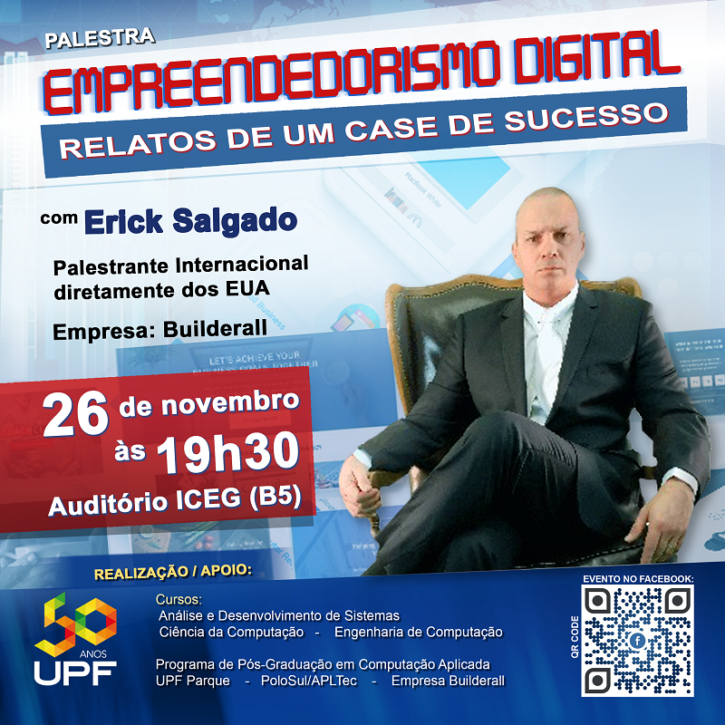 Os cursos de Análise e Desenvolvimento de Sistemas, Ciência da Computação e Engenharia de Computação da Universidade de Passo Fundo (UPF) promovem, no dia 26 de novembro, a palestra “Empreendedorismo digital: relatos de um case de sucesso”, com Erick Salgado. A atividade ocorre a partir das 19h30min, no auditório Professor Jair Bochi Cordeiro, no Instituto de Ciências Exatas e Geociências (Iceg) da UPF. Não é necessário realizar inscrição.