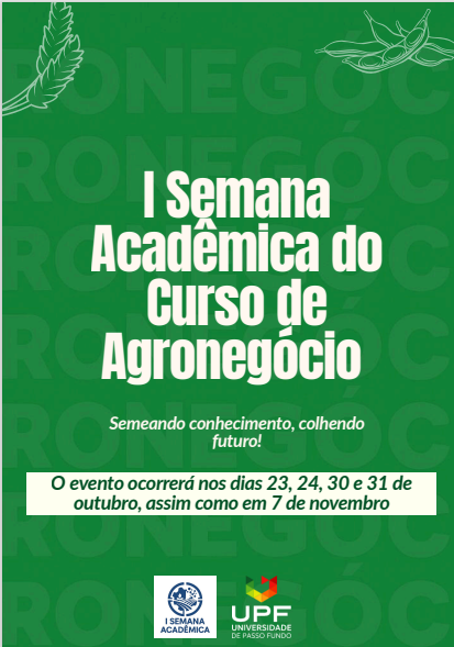O curso de Agronegócio da Universidade de Passo Fundo (UPF) promove, entre os dias 23, 24, 30, 31 de outubro e 7 de novembro, a I Semana Acadêmica, com o tema “Semeando conhecimento, colhendo futuro”. O evento reúne estudantes, professores e profissionais do setor para discutir temas atuais e estratégicos que envolvem toda a cadeia produtiva do agronegócio, da produção à comercialização.