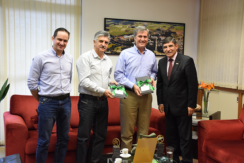 O reitor da Universidade de Passo Fundo (UPF), José Carlos Carles de Souza, recebeu, na tarde de sexta-feira, 13 de abril, o representante de investimentos na América Latina do estado de Queesland, Austrália, Alejandro Pessagno. A visita contou ainda com a presença do representante internacional da BSBIOS, Domenico Italo Barone, da ECB Group Switzerland SA, e do engenheiro agrônomo e representante da área comercial da BSBIOS, Fábio Junior Benin, que possuem parceria com o governo do estado australiano e que sugeriram a visita na Universidade.
