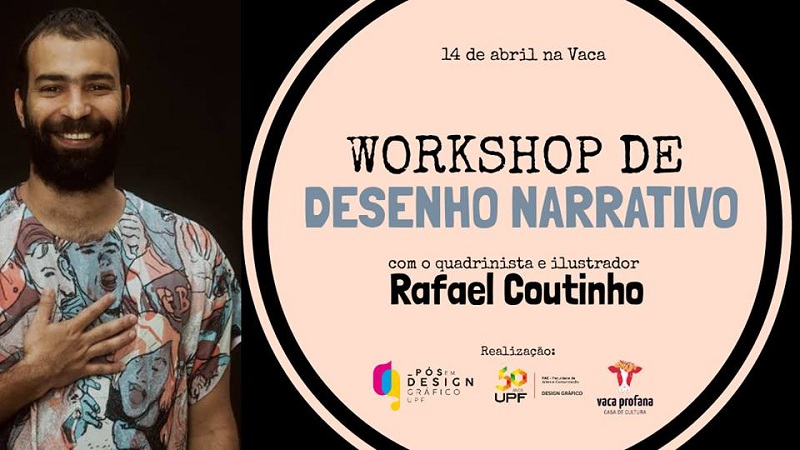 O curso de especialização em Design Gráfico da Universidade de Passo Fundo (UPF), por meio da disciplina de Design Editorial, promove, no próximo domingo, dia 14 de abril, um workshop de desenho narrativo com Rafael Coutinho. A atividade será realizada em parceria com a Casa de Cultura Vaca Profana, onde ocorre o workshop, e tem como objetivo desbravar novas formas de se entender histórias em quadrinhos, tirando do jogo narrativo a obrigação do traço educado, bem como a necessidade de linearidade – começo, meio e fim –, o virtuosismo, a busca por um estilo maduro.