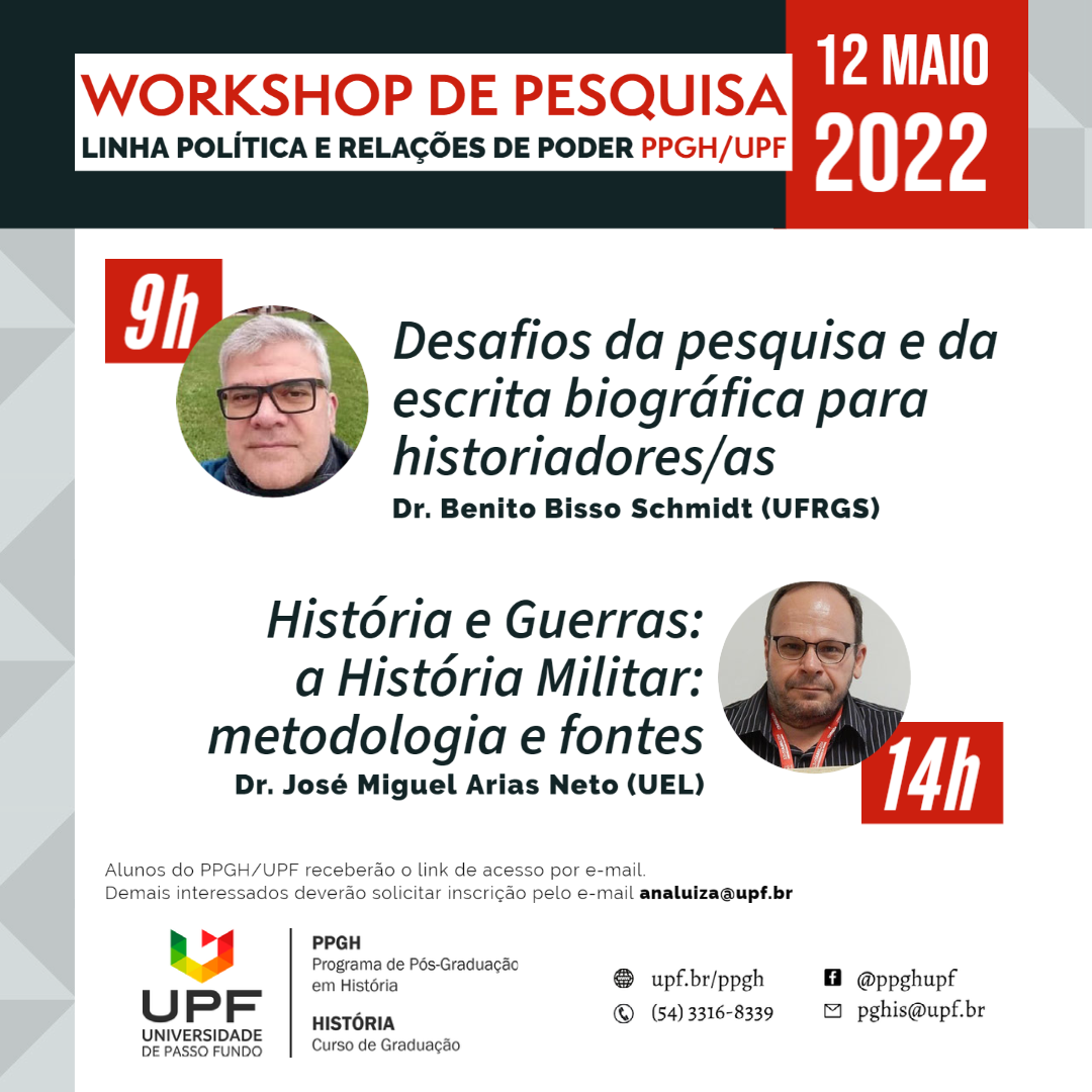 O Programa de Pós-Graduação em História da Universidade de Passo Fundo (PPGH/UPF) promove, nos dias 12 e 13 de maio, os Workshops das Linhas de Pesquisa, com o objetivo de socializar e debater diversos temas. As atividades são voltadas aos estudantes do PPGH, aos pós-graduandos Minter FCR/UPF e aos demais interessados.