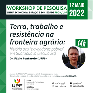 12/05 – 14h: Terra, trabalho e resistência na fronteira agrária: história dos “povoadores nobres” em Guarapuava (Século XIX) – Dr. Fábio Pontarolo (UFFS)