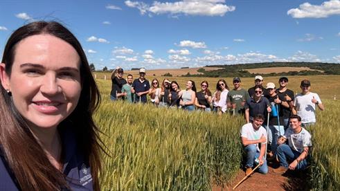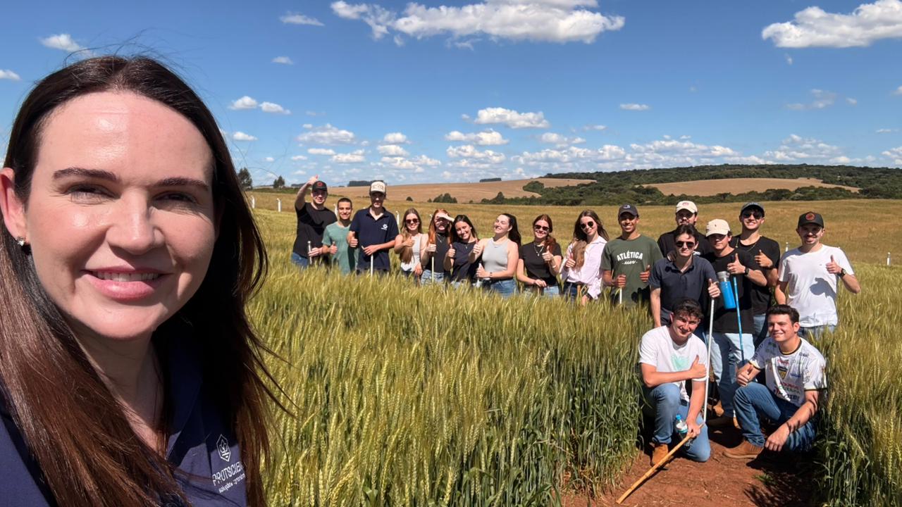 No dia 4 de novembro, os acadêmicos do 4º nível do curso de Agronomia da Universidade de Passo Fundo (UPF) participaram de uma atividade prática da disciplina de Fitopatologia, ministrada pela professora Carolina Deuner. A turma visitou os ensaios de trigo da empresa ProtScience, vivenciando de perto o manejo adotado pelos produtores no controle de doenças da cultura.