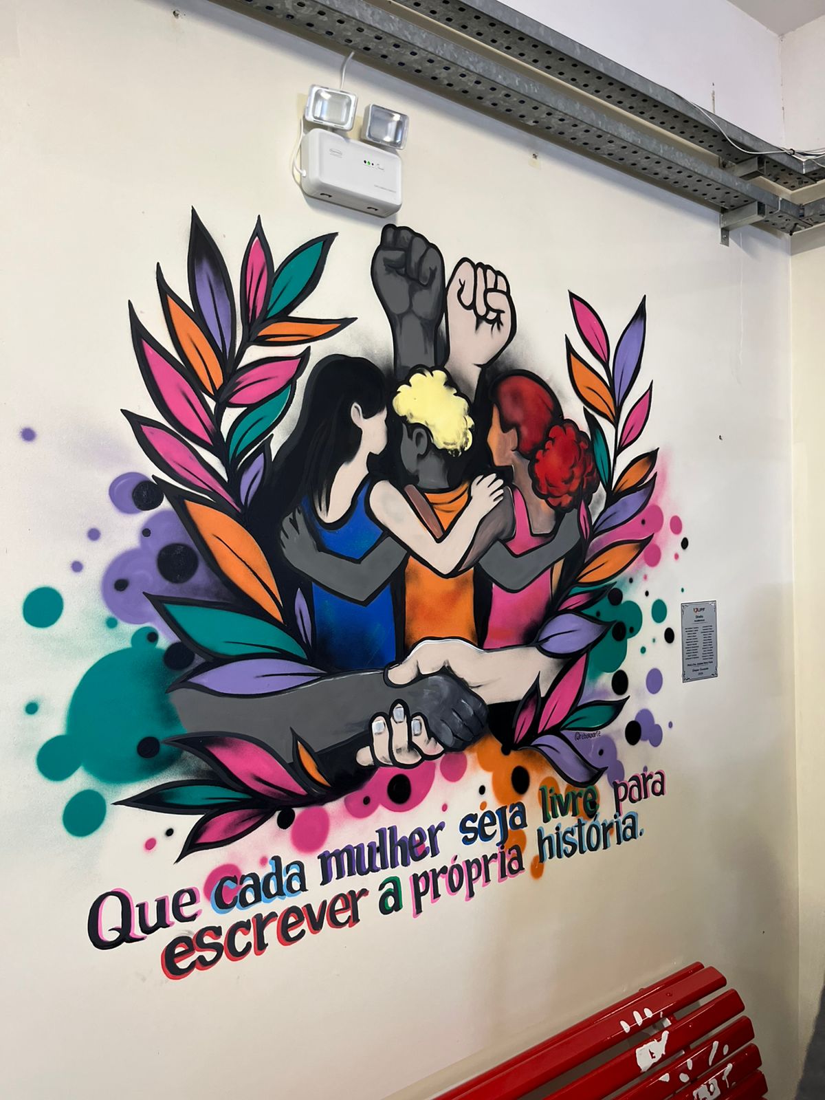 Segundo Josiane, a pintura lembra que toda mulher deve ser livre para escrever a sua própria história, ou seja, a urgência das mulheres por existir sem medo, por escrever sua própria história sem que a violência a interrompa. Já as frases nas escadas, conforme a docente, convidam à reflexão a cada passo, trazendo dados e mensagens que reforçam a importância de não naturalizar a violência. “Pelo campus, camisetas penduradas estampam palavras que chocam e sensibilizam, manchadas como se fossem sangue, simbolizam o preço da indiferença. Nas portas, a frase que nos dá esperança e desafio: ‘DIAS MULHERES VIRÃO’. E, atrás do banco vermelho, também realizado pela mesma turma no ano passado, encontramos uma mensagem que reforça nosso compromisso contínuo com esta causa. Essa união de esforços é um testemunho de que estamos juntos nessa luta, não apenas como estudantes, mas como agentes de mudança”, complementou a professora.