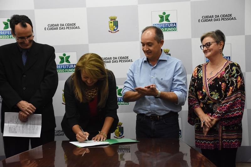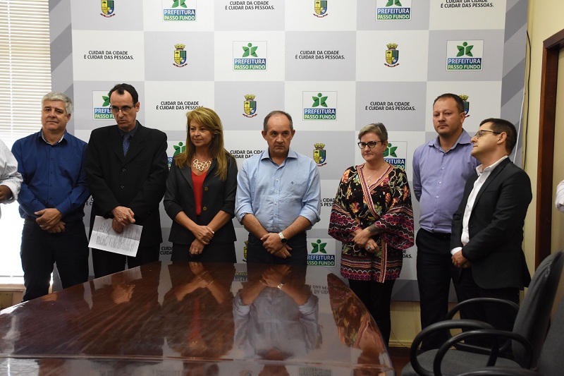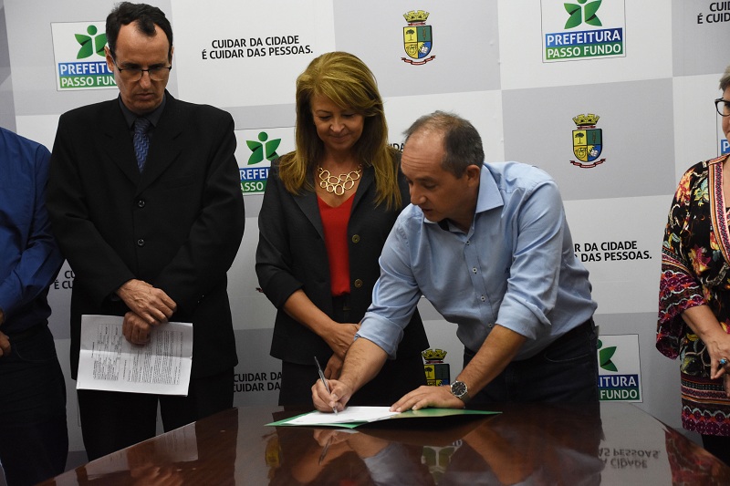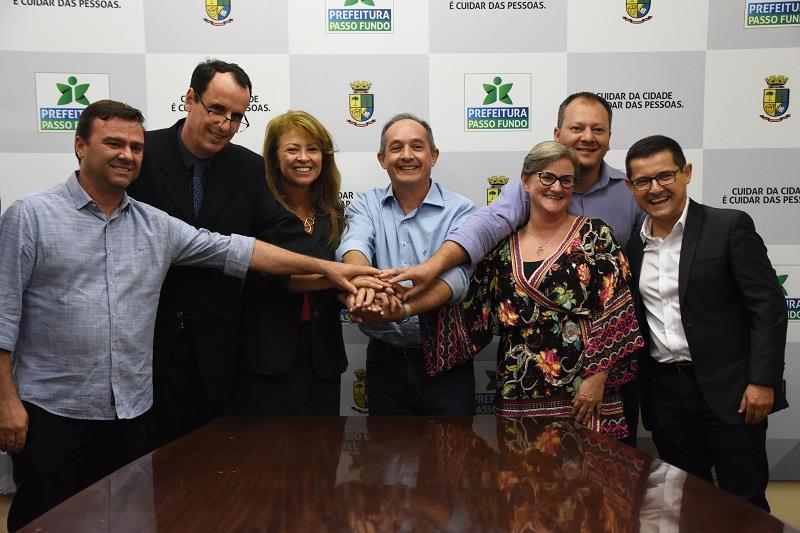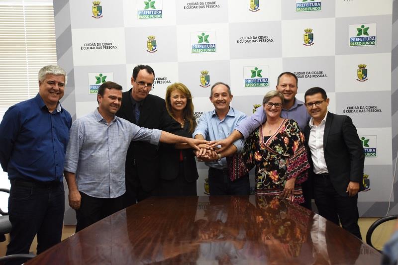 A Universidade de Passo Fundo (UPF) e a Prefeitura de Passo Fundo assinaram, na tarde desta sexta-feira, dia 8 de março, um novo convênio que tem como objetivo reforçar o atendimento prestado à comunidade no pronto-atendimento do Hospital Beneficente Dr. César Santos. A assinatura foi realizada no gabinete do prefeito Luciano Azevedo com a presença dele, da reitora da UPF, professora Dra. Bernadete Maria Dalmolin; do vice-reitor de Graduação professor Dr. Edison Alencar Casagranda; do diretor da Faculdade de Medicina professor Dr. Paulo Reichert; do diretor do Hospital Municipal Roger Teixeira Borges; e da secretária de Saúde do município Carla Beatrice Gonçalves; além de demais secretários municipais e vereadores.