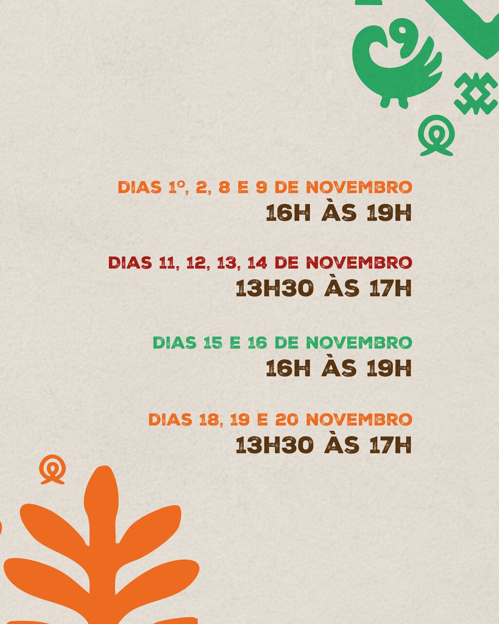Dias 1º, 2, 8 e 9: das 16h às 19h