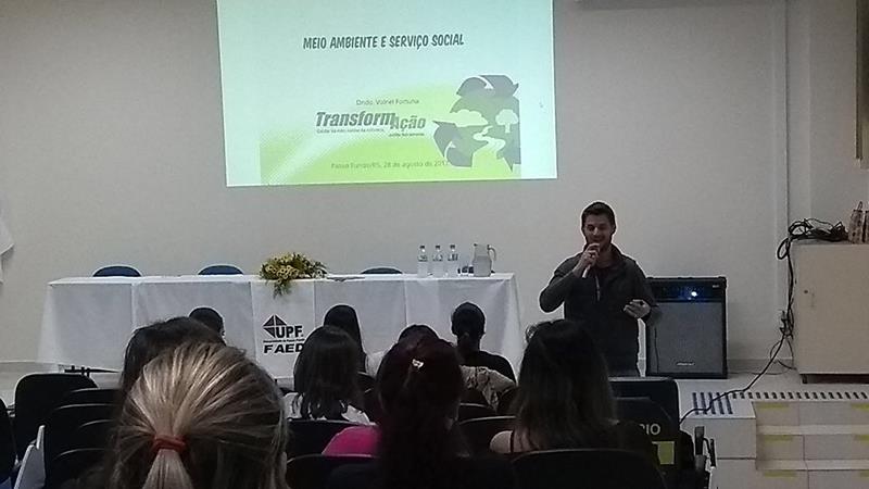 O curso de Serviço Social da Universidade de Passo Fundo (UPF) reuniu alunos e professores para debater a temática “Meio Ambiente e Serviço Social”. O encontro aconteceu no auditório da Faculdade de Educação (Faed) na noite dessa segunda-feira (28/08). Os painelistas convidados foram a professora Claudia Petry, do curso de Agronomia da UPF, e Volnei Fortuna, coordenador do Projeto Transformação.