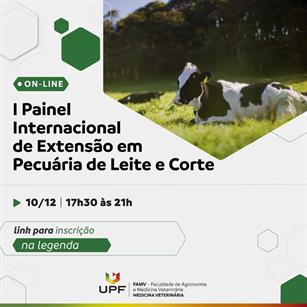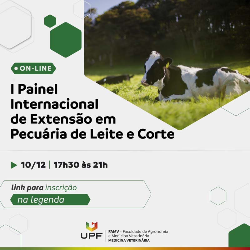 Com o objetivo de promover uma reflexão sobre a situação atual e as perspectivas da pecuária de corte e leite para os próximos anos, a UPF, por meio do curso de Medicina Veterinária, Diretório Acadêmico da Faculdade de Agronomia e Medicina Veterinária e Divisão de Extensão, promove o I Painel Internacional sobre pecuária sustentável e impactos na sucessão familiar. O encontro ocorre de forma virtual, com transmissão pelo canal do Youtube da UPF Online, nos dias 10 e 17 de dezembro. A programação inicia às 17h30min e se estende até as 21h em ambos os dias.