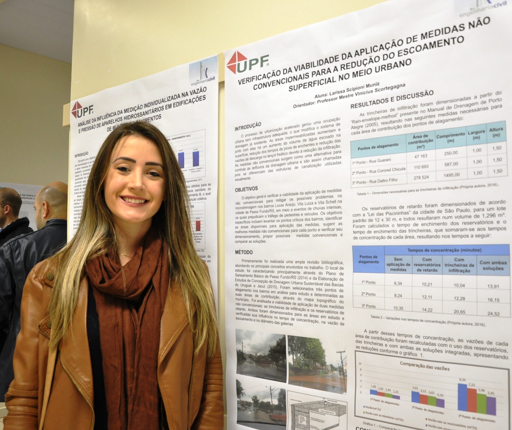 A formanda do curso de Engenharia Civil da Universidade de Passo Fundo (UPF) Larissa Scipioni Muniz, 22 anos, desenvolveu seu Trabalho de Conclusão de Curso (TCC) voltado para a redução de alagamentos no meio urbano utilizando métodos não convencionais e mais sustentáveis. A pesquisa foi aplicada em três pontos de Passo Fundo, que costumam registrar alagamentos. A aluna concluiu que os métodos utilizados representam uma alternativa viável de ser aplicada em critérios de disponibilidade de espaço, redução de vazão e melhoria no sistema de drenagem urbana.