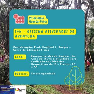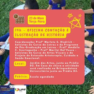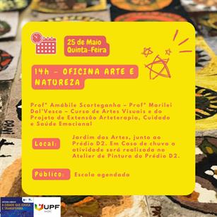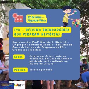 - Local: Jardim das Artes, junto ao prédio D2, Campus I da UPF. Em caso de chuva, a oficina será realizada no Mundo da Leitura.