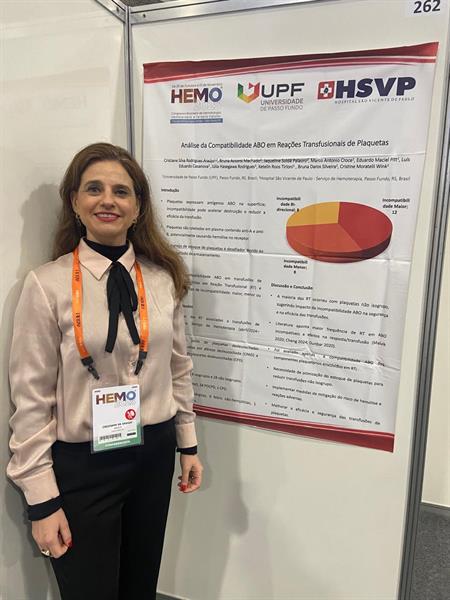Durante o congresso, a professora apresentou três trabalhos científicos desenvolvidos com alunos do curso de Medicina da UPF, vinculados ao projeto de extensão “4 Pilares para Obtenção da Segurança Transfusional”, que integra ações de ensino, pesquisa e extensão voltadas à segurança e à qualidade dos processos transfusionais.