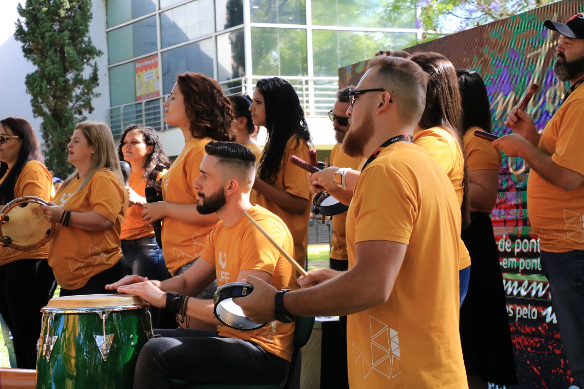 “Vamos entrar em 2023 todos no mesmo ritmo”. O convite do professor do curso de Música Me. Marcio Tolio foi simbólico, mas também literal. É que pela primeira vez, todos foram convidados a interagir, enquanto o Grupo de Percussão, acompanhado por funcionários e professores da Universidade, tocava o clássico de Alceu Valença “Anunciação”. Com palmas e instrumentos que estavam espalhados pelo gramado do Campus I, todos se tornaram um só. E essa foi justamente a ideia do Momento UPF: mostrar que, mesmo com muitos desafios e transformações, a Universidade de Passo Fundo segue unida. O encontro realizado nesta sexta-feira, 16 de dezembro, serviu para celebrar as conquistas do ano de 2022 e brindar as novas possibilidades que virão em 2023.