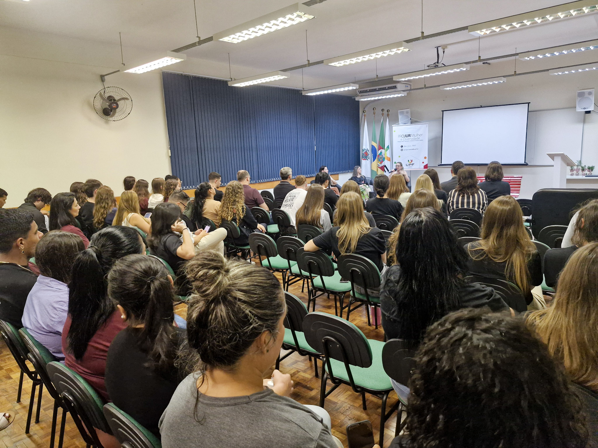 A noite foi marcada por uma roda de conversa com o tema “Impasses feministas, desigualdades de gênero e os filhos esquecidos do feminicídio: o cotidiano das mulheres em um mundo de violências”, apresentado por Karen Massucatto e a Alice Benvegnú, advogadas e docentes do Direito UPF. O debate foi conduzido por conselheiras do Conselho Municipal dos Direitos da Mulher, mediado pela professora do curso de Direito, Vivian Cruz Neves, contando com a participação da comunidade acadêmica.