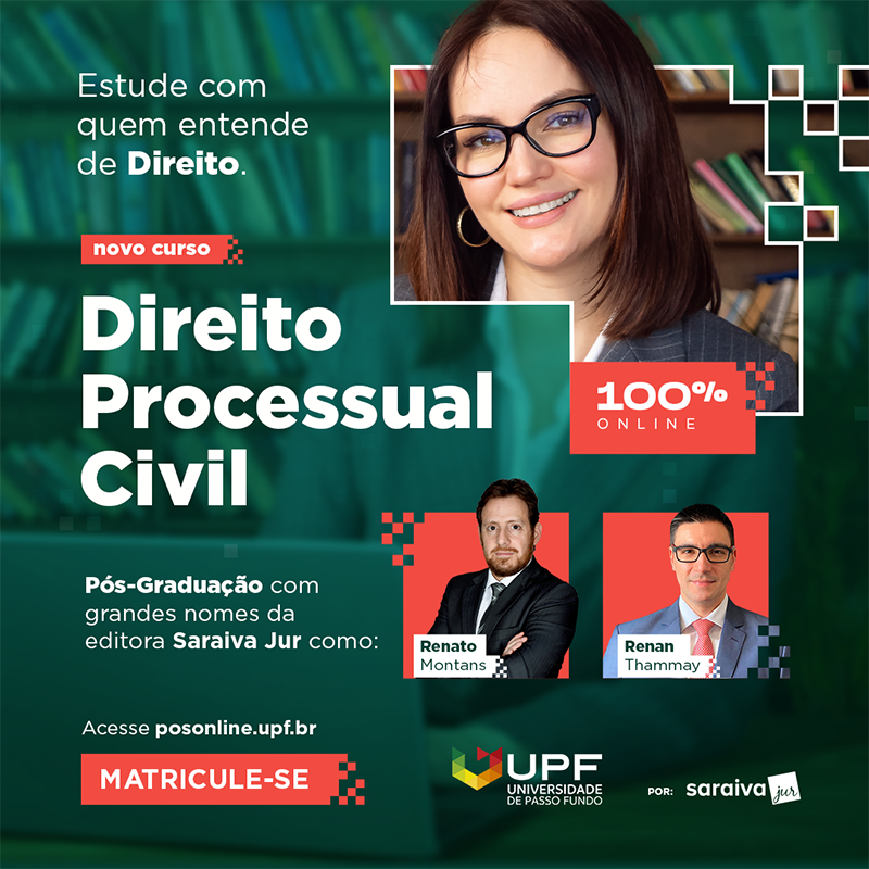 Um novo curso de especialização totalmente on-line é oferecido pela UPF. Em parceria com a Editora de Direito Saraiva Jur, já é possível se inscrever para a Especialização em Direito Processual Civil. A grade curricular conta com aulas ministradas por grandes nomes da editora como Renato Montans e Renan Thammay.