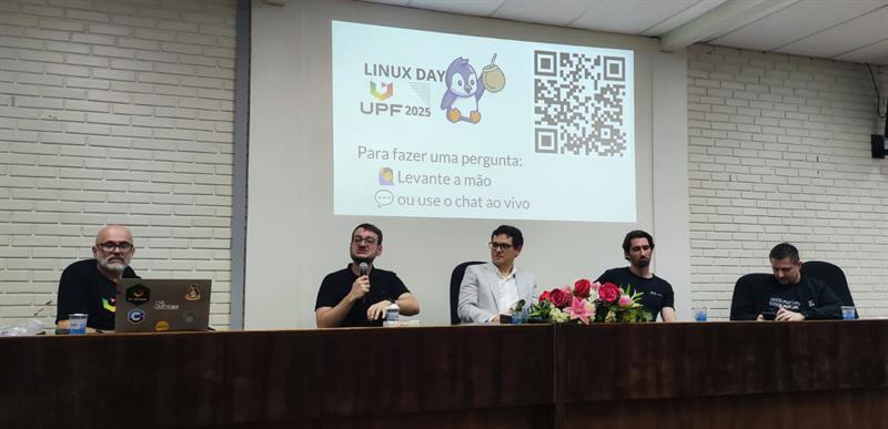 Um dos destaques da programação foi a mesa-redonda “Do campo ao supercomputador: a versatilidade do Linux na prática”, realizada no dia 21 de outubro, no auditório do prédio B5, Campus I da UPF. Mediado pelo professor Marcos José Brusso, o encontro apresentou cases reais de aplicação do Linux em diferentes setores, demonstrando como o sistema operacional está presente desde a automação no agronegócio até a infraestrutura de servidores e supercomputadores.