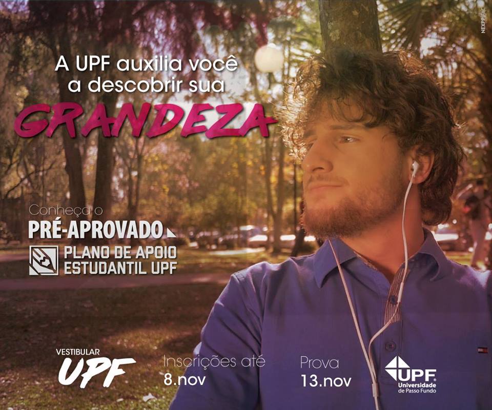A UPF está com inscrições abertas para o processo seletivo do Vestibular de Verão 2017. Neste processo seletivo, são ofertadas vagas para 57 cursos de graduação nas diversas áreas do conhecimento, em diferentes turnos e campi. As inscrições podem ser feitas até 8 de novembro, pelo site vestibular.upf.br, onde também é possível acessar a lista de cursos oferecidos e todas as demais informações sobre essa edição do vestibular. As provas ocorrem no dia 13 de novembro, no Campus I, em Passo Fundo, e nos campi Carazinho, Casca, Lagoa Vermelha, Sarandi e Soledade. Dúvidas sobre o Vestibular podem ser esclarecidas pelo telefone 0800-701-8220 ou pelo e-mail informacoes@upf.br.